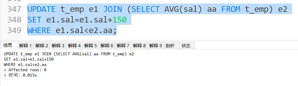 UPDATE t_emp e1 JOIN (SELECT AVG(sal) aa FROM t_emp) e2 ON e1.sal<e2.aa SET e1.sal=e1.sal+150;