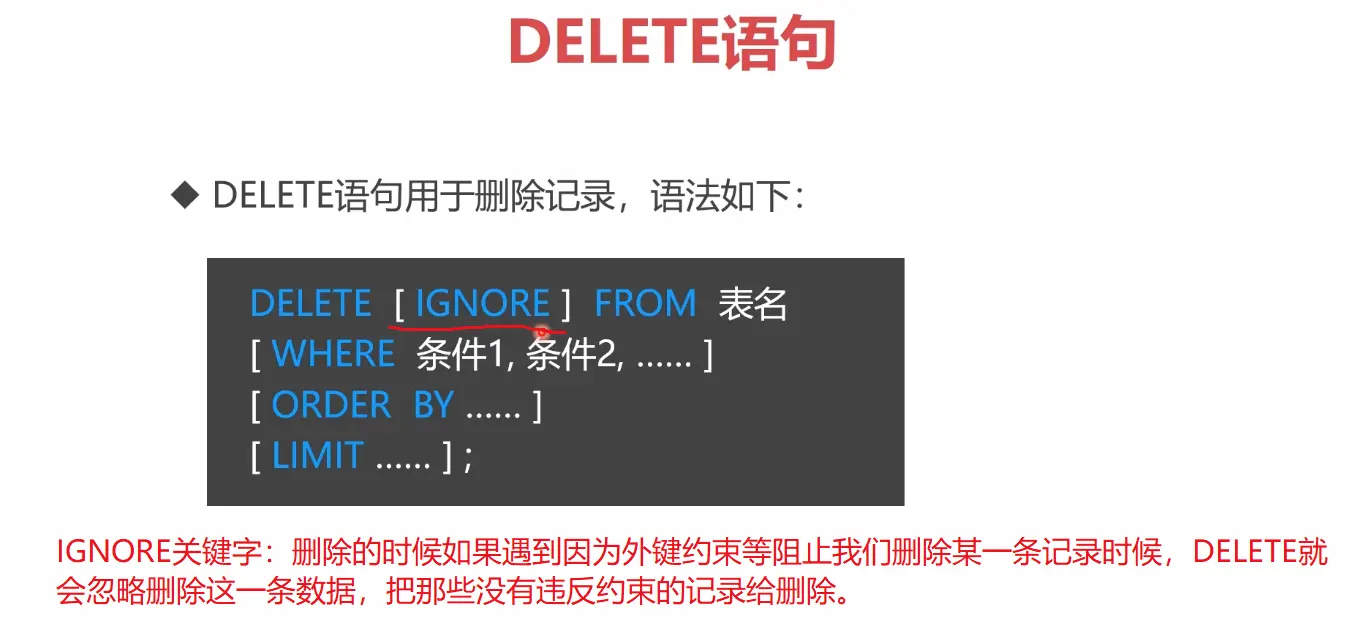 执行顺序:FROM子句→WHERE子句→ORDER BY子句→LIMIT子句→DELETE子句;