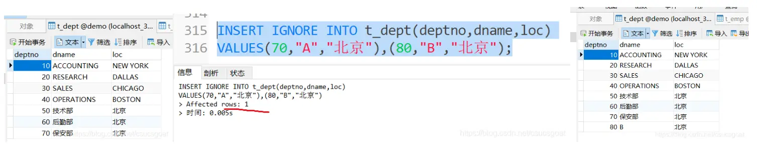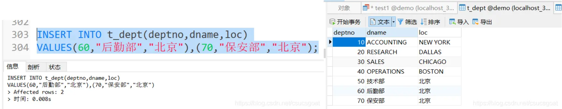 案例2:一次插入多条数据 :向t_dept表中增加多条记录;
