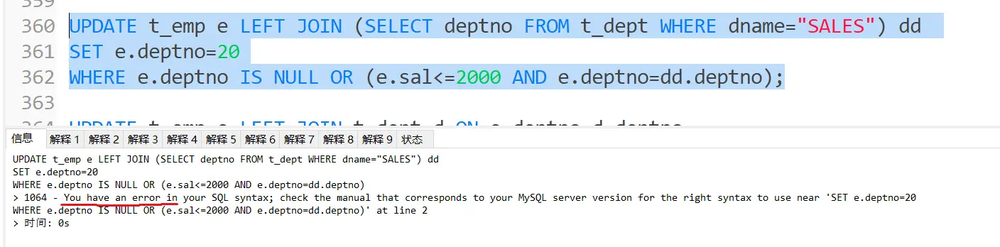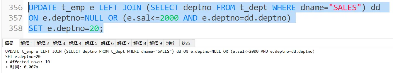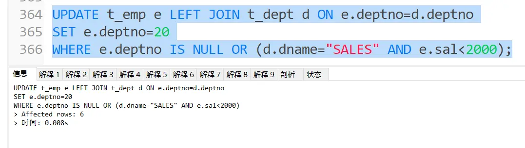 UPDATE t_emp e LEFT JOIN (SELECT deptno FROM t_dept WHERE dname=“SALES”) dd SET e.deptno=20 WHERE e.deptno IS NULL OR (e.sal⇐2000 AND e.deptno=dd.deptno);