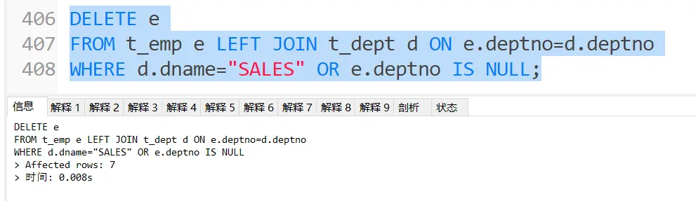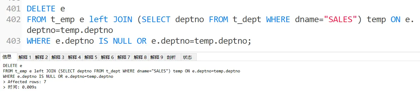 DELETE e FROM t_emp e LEFT JOIN t_dept d ON e.deptno=d.deptno WHERE d.dname=“SALES” OR e.deptno IS NULL;