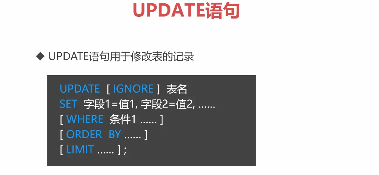 ● UPDATE子句,选择要修改的表;UPDATE子句只执行一次;
