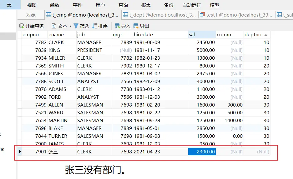涉及到多张表,需要表连接;张三没有部门,连接时需要保留,所以需要外连接;