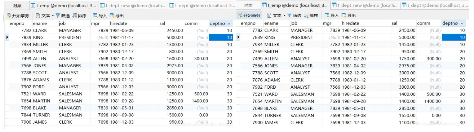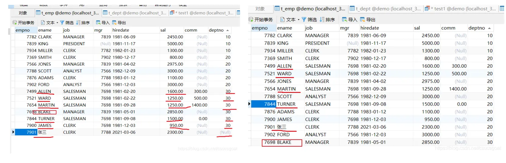 分析:执行过程是,现将俩表做笛卡尔积(因为没有使用ON子句啦)从t_emp表中筛选出e.name=“ALLEN”这条记录,从t_dept表中筛选出d.dname=“RESEARCH”这条记录, 其实,这所谓的两条记录在【笛卡尔积】中是在一条记录上的; 此时,已经分别在两个表中各获得了一条记录,然后分别在获取的这两条记录上执行执行【SET e.deptno=d.deptno,e.job=“ANALYST”,d.loc=“成都”】。然后,对此条记录的操作就能影响到原表上。