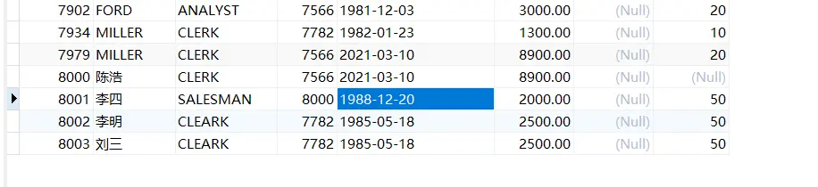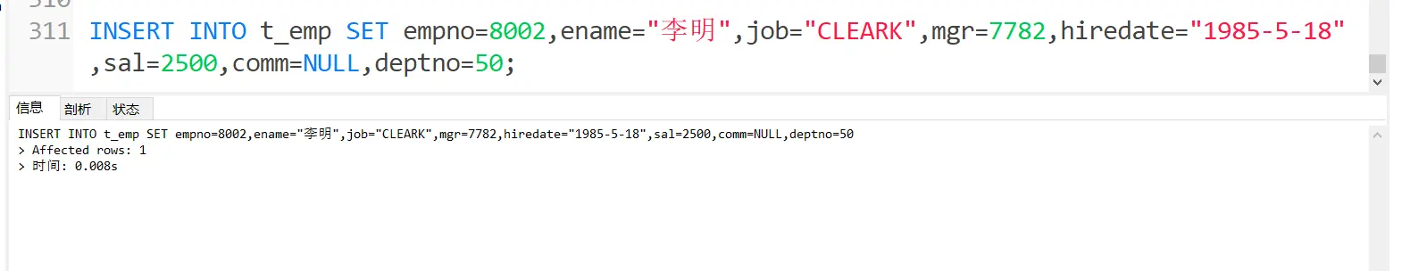 INSERT INTO t_emp SET empno=8002,ename="李明",job="CLEARK",mgr=7782,hiredate="1985-5-18",sal=2500,comm=NULL,deptno=50;