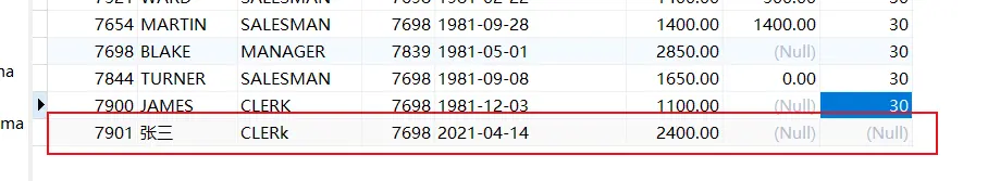 INSERT t_emp SET empno=8003,ename="刘三",job="CLEARK",mgr=7782,hiredate="1985-5-18",sal=2500,comm=NULL,deptno=50;
