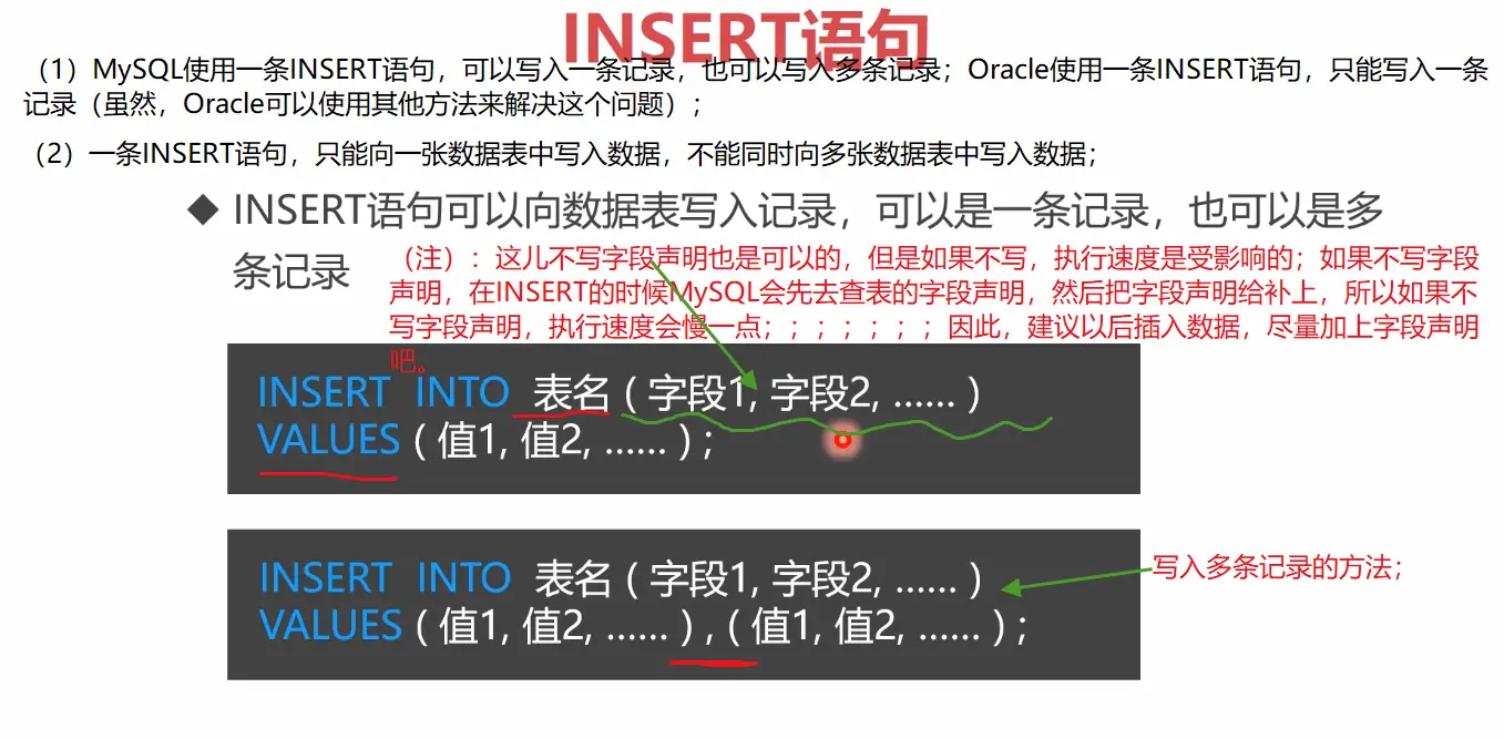 (1)INSERT语句可以一次写入一条记录,也可以一次写入多条记录;