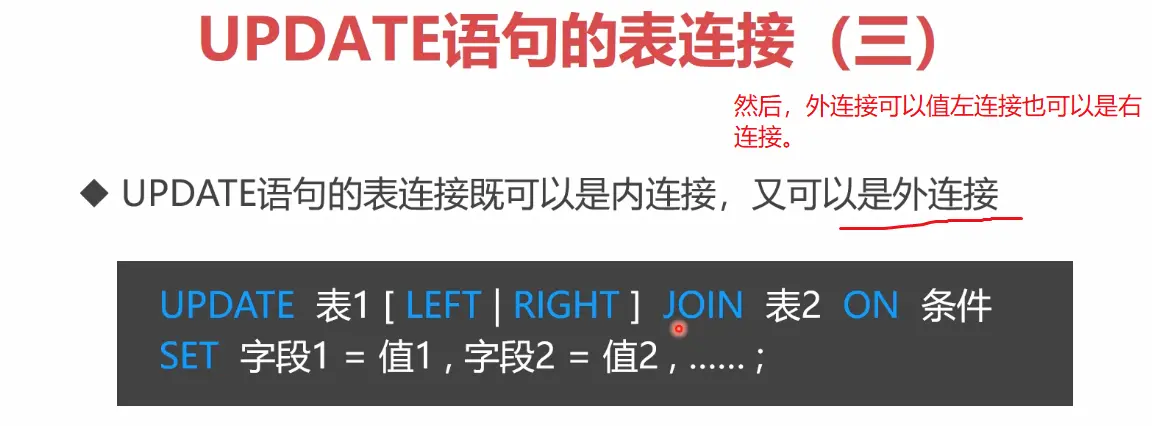UPDATE语句的表连接的第三种方式:外连接的语法,外连接的时候,条件只能写在ON子句中,, ,而且ON子句不能少!!!!!