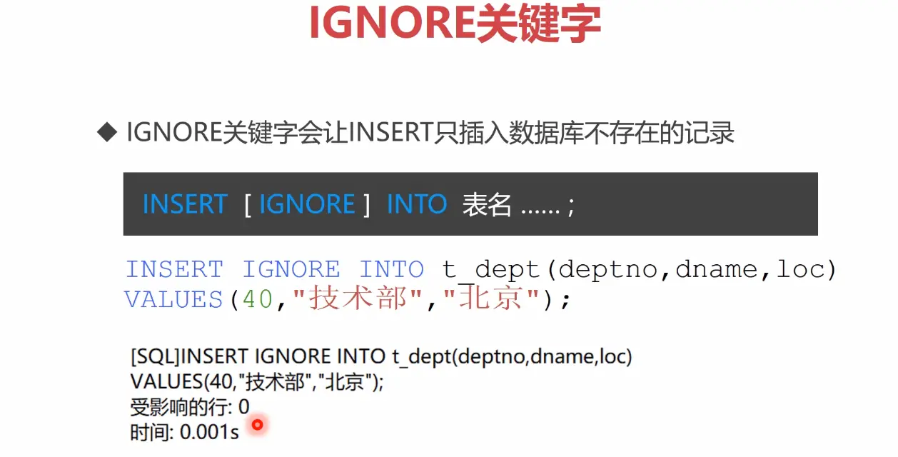 IGNORE关键字:可以让INSERT语句忽略冲突的记录,只写入那些不冲突的记录。比如用INSERT写入多条记录的时候,某一条记录数据没写对,产生了注入主键冲突或唯一值的冲突等,此时,数据库会报错然后整个INSERT语句连一条语句都写不进去。。。但是如果使用了IGNORE关键字,就可以忽略冲突的记录,不冲突的记录还是能写到数据库里的;