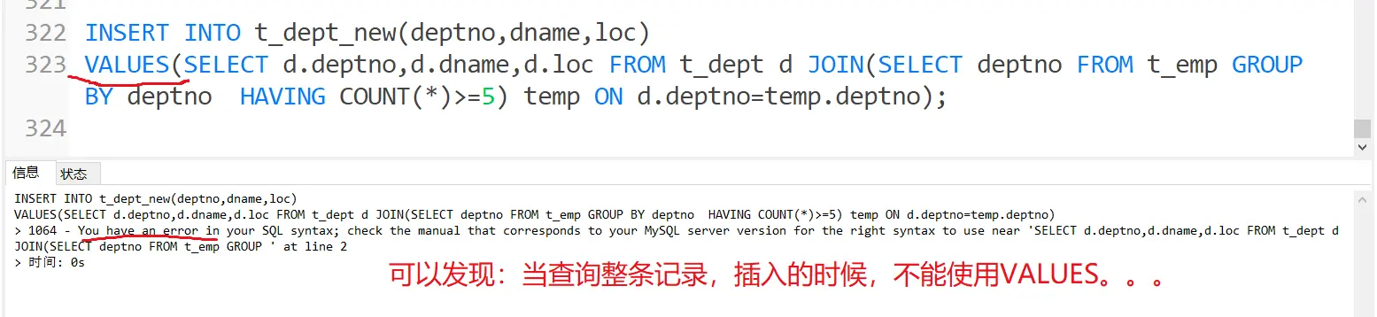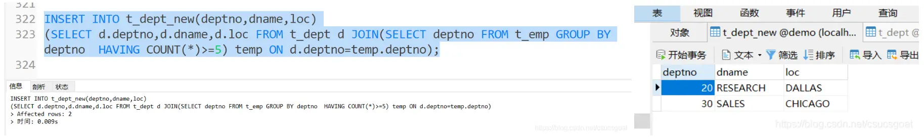 然后,查询数据,将查询的数据插入到t_dept_new表中:下面省略了VALUES哎。