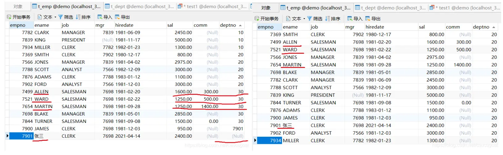 动动脑子:在左连接的时候,左边的记录都会被保留下来!!!!!!!!!!所以,这儿的结果是错误的,deptno全变成20了。。。