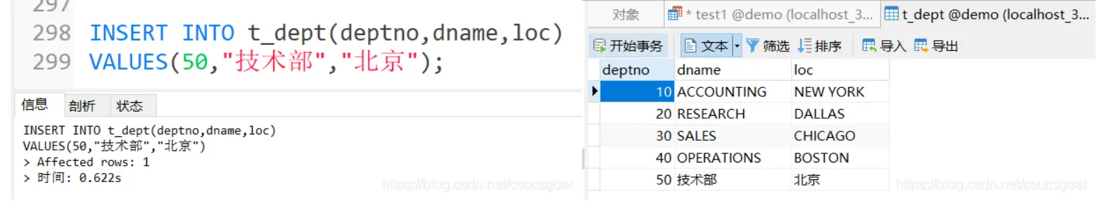 案例1:一次插入一条数据 :向t_dept表中增加一条记录;