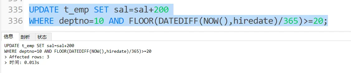 UPDATE t_emp SET sal=sal+200 WHERE deptno=10 AND FLOOR(DATEDIFF(NOW(),hiredate)/365)>=20;
