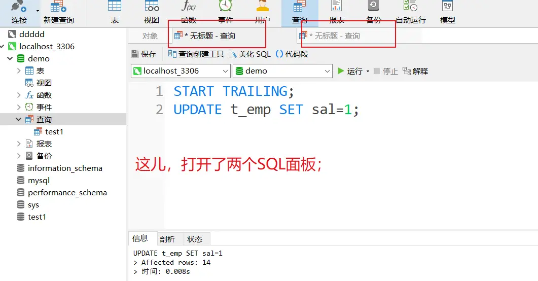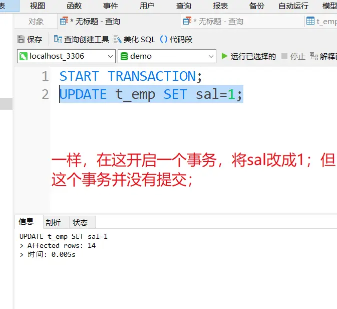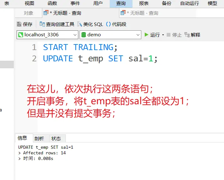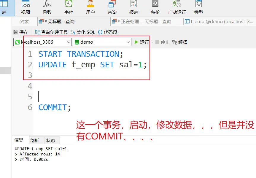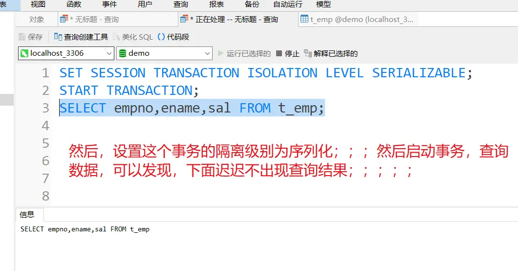 其中, “SET SESSION”意思是,设置当前会话的事务隔离级别;这种设置不是全局的,只在当前会话生效 ;会话的意思是:在Navicat中打开一个SQL面板,编写SQL语句,这个就是一个会话,当把这个面板关了,这个会话就结束了;