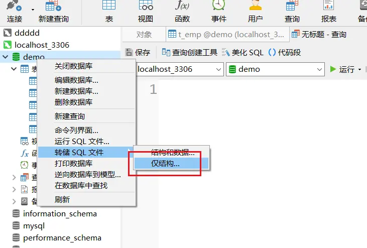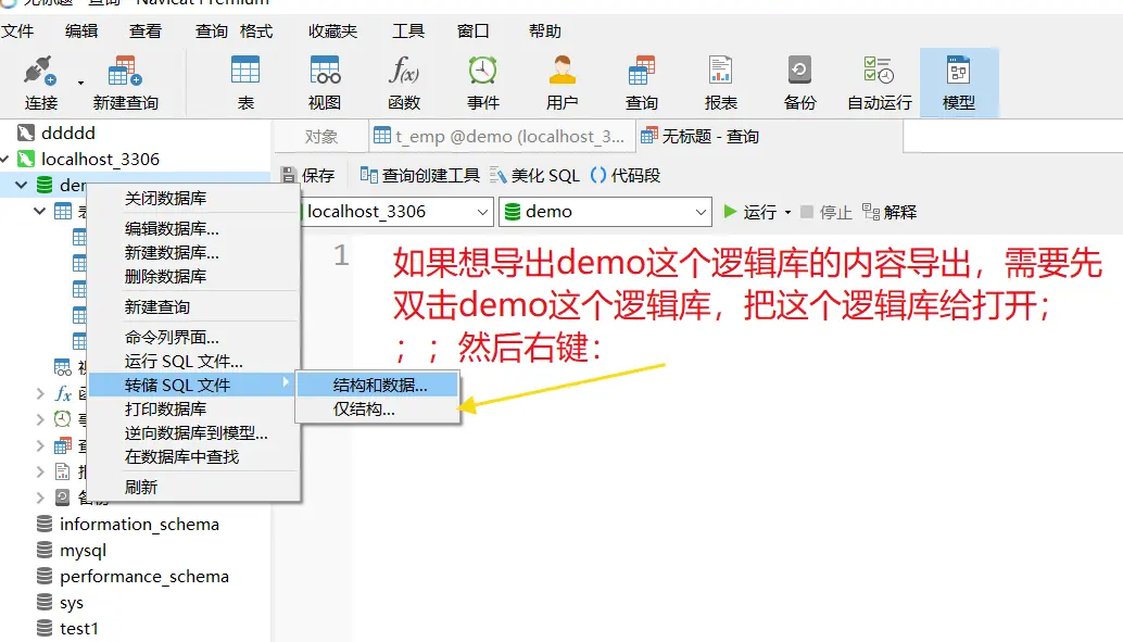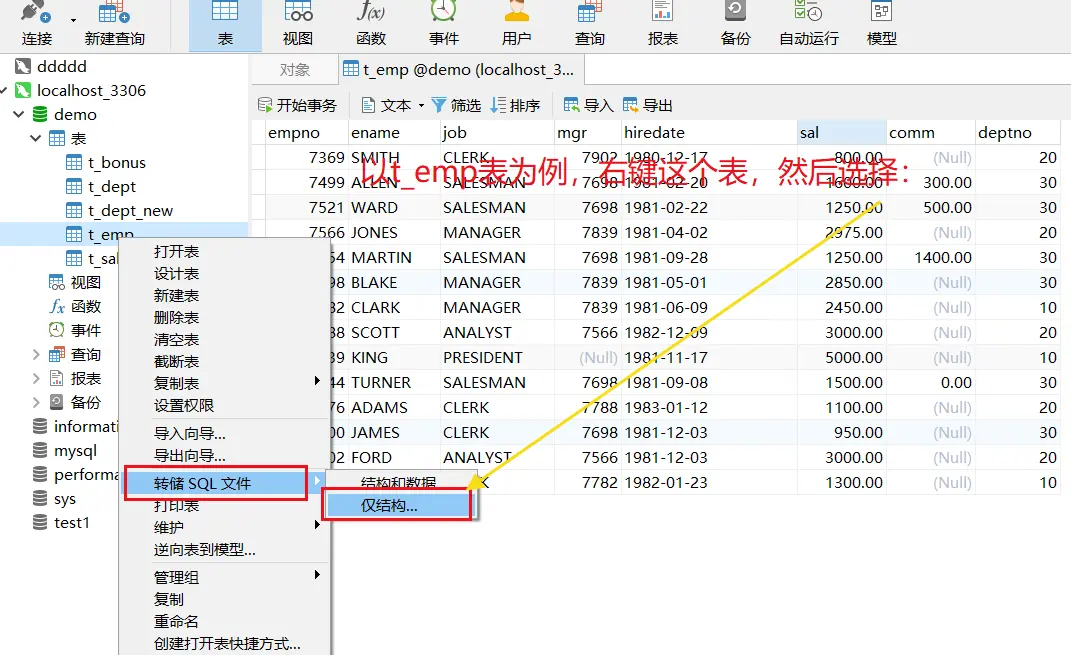 导出成SQL文档:这其中包含了表结构【CREATE TABLE建表语句,GREATE INDEX创建索引语句】,也包含了业务数据【INSERT INTO插入记录的语句】;