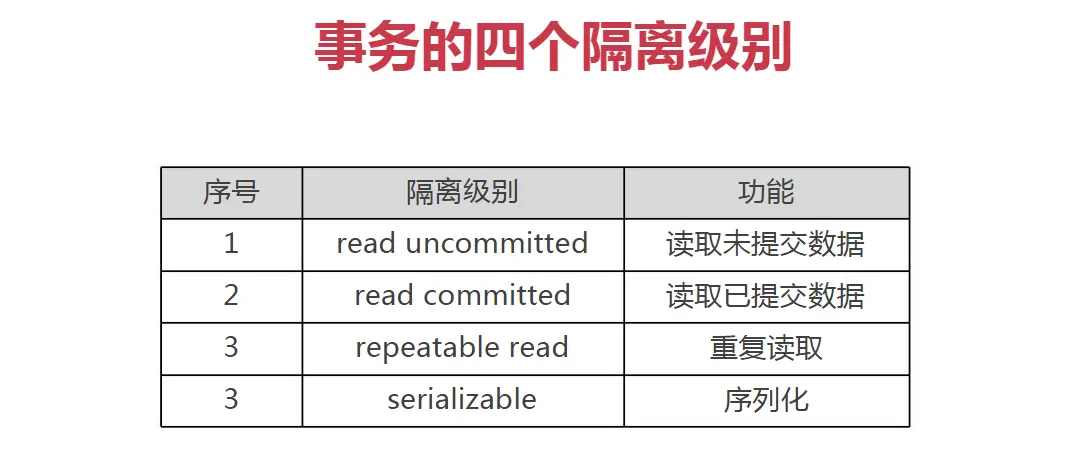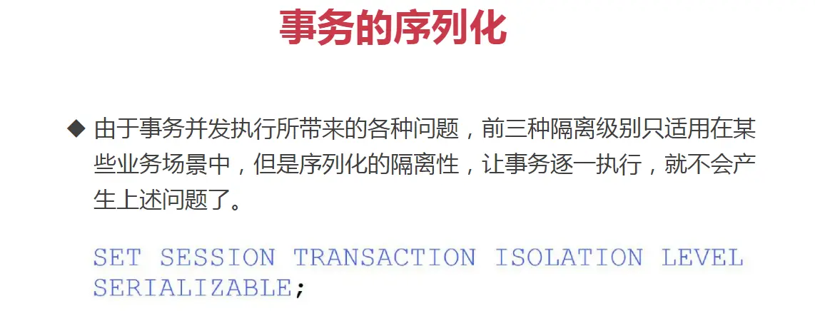序列化隔离级别:一旦设置了这种隔离级别后,当前会话里的事务,需要等待其他事务执行结束之后,才可以执行,不再会出现并发执行的事务了;虽然序列化执行事务能避免一切业务场景上的问题,但是随之而来的是数据库的并发性能急剧下降;;;;;所以,这种隔离级别是很少使用的;