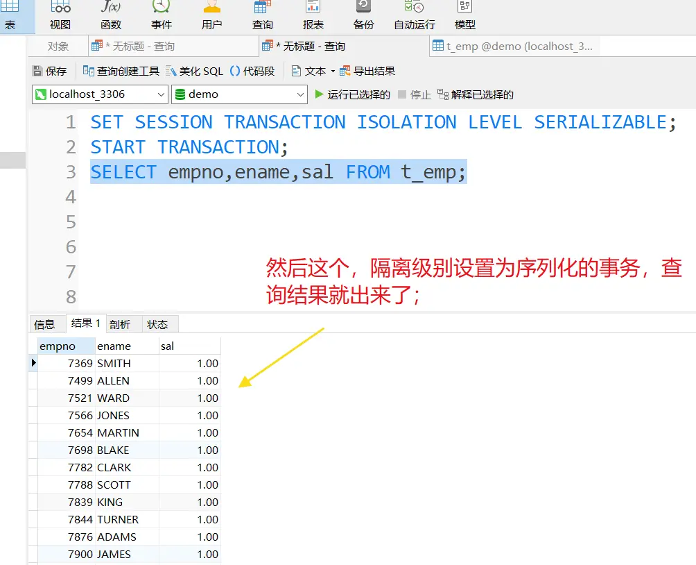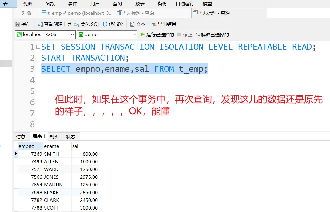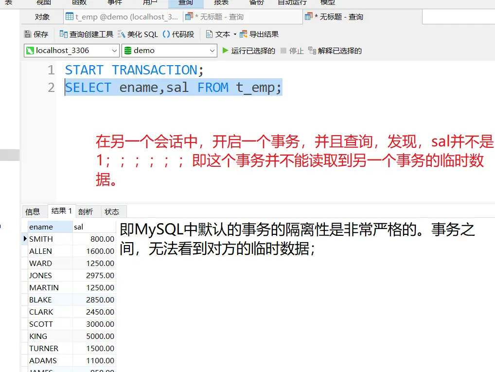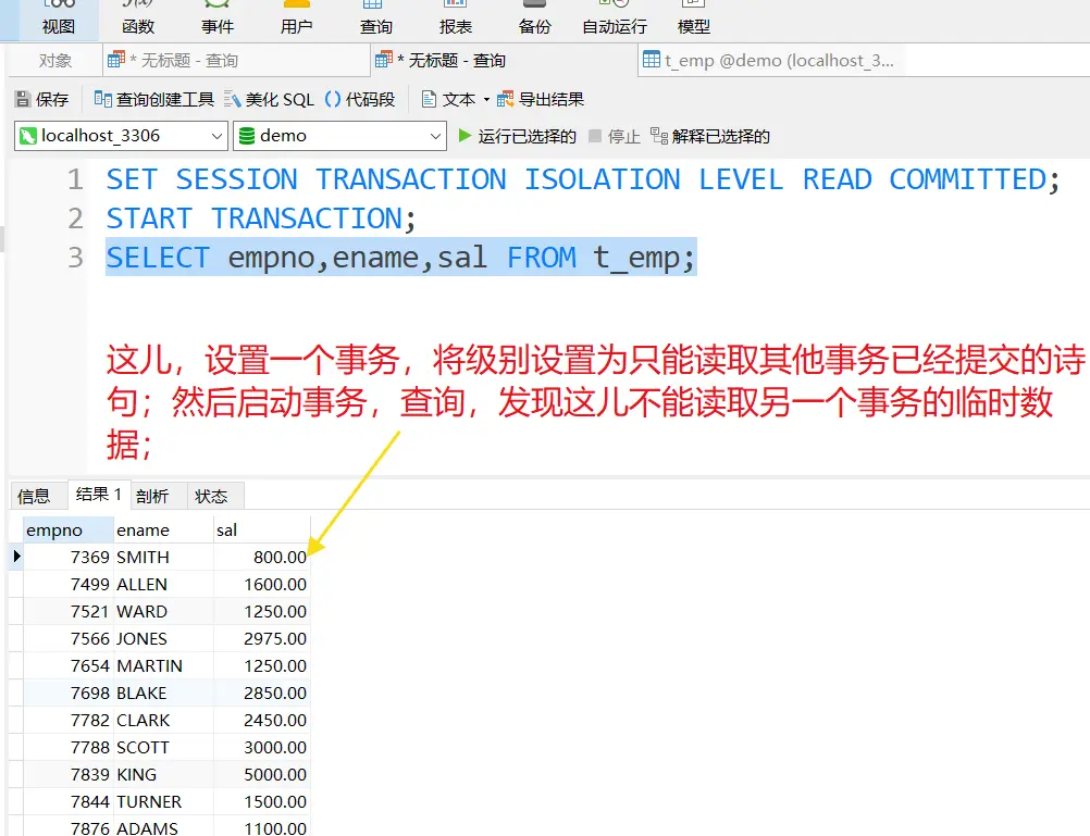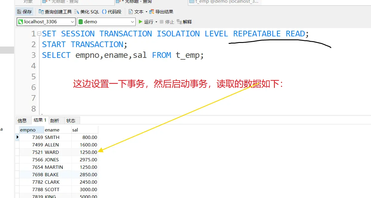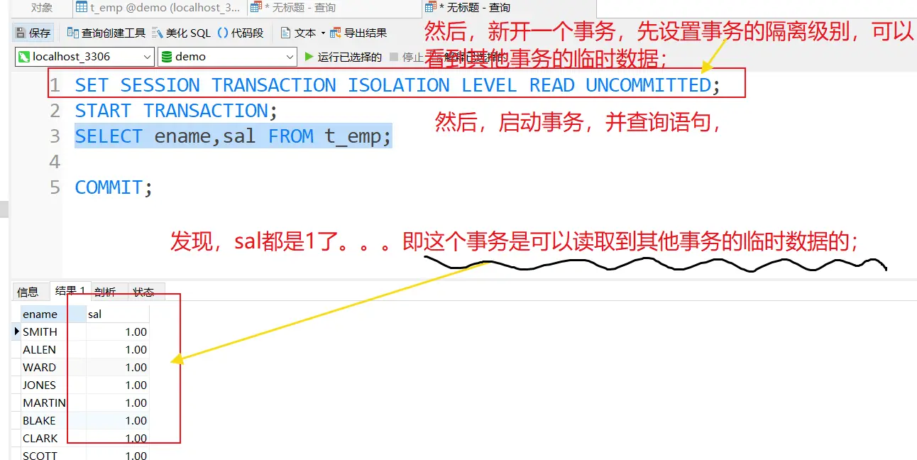 下面需要说明一点:一个事务在执行select操作之后,才能把数据表中的数据copy到undo日志中;;;即下面的事务,如果在【上面的将sal设置为1的事务】提交之前没有select,当【上面的将sal设置为1的事务】提交之后,下面这个事务再第一次执行select的话,其查询的结果就是sal已经被设置为1的t_emp表的数据了 ;( _ _ 好吧,undo日志和redo日志的原理需要了解一下。。。。__ )