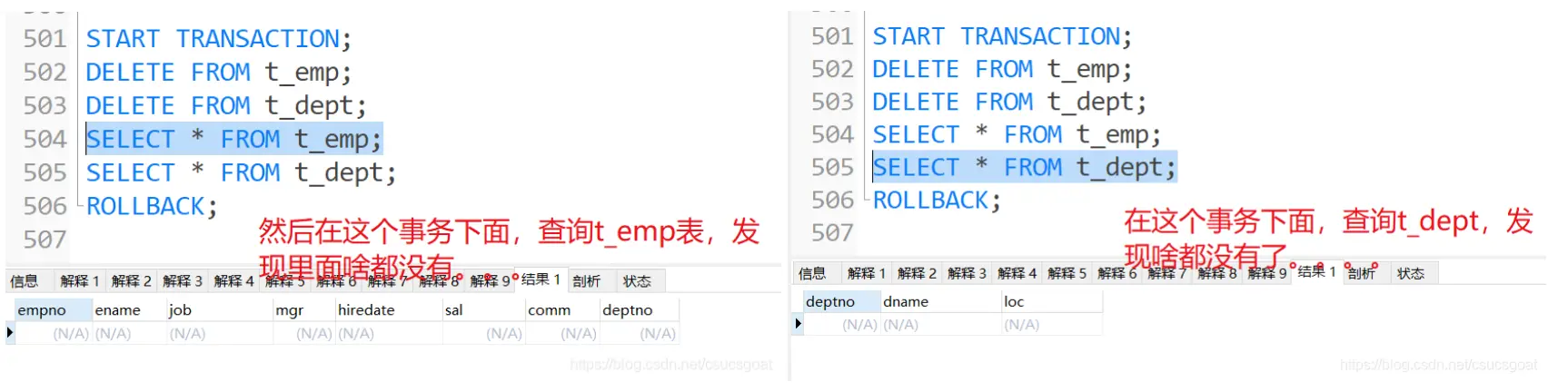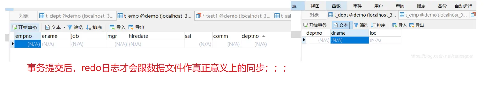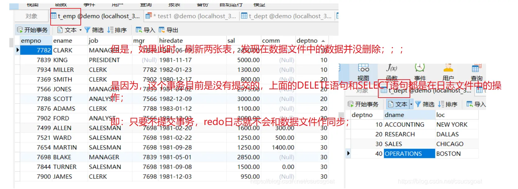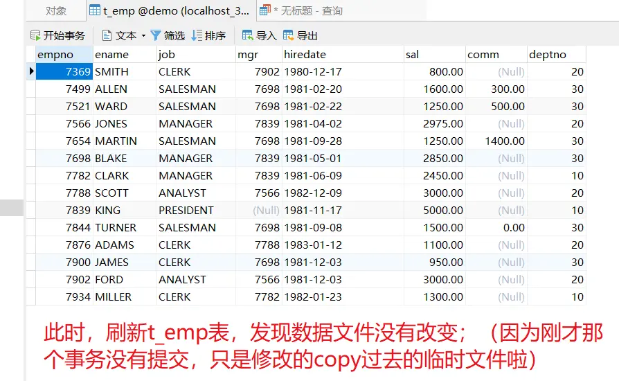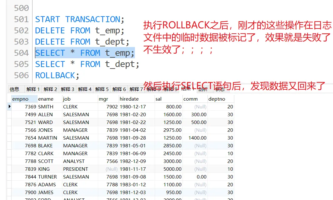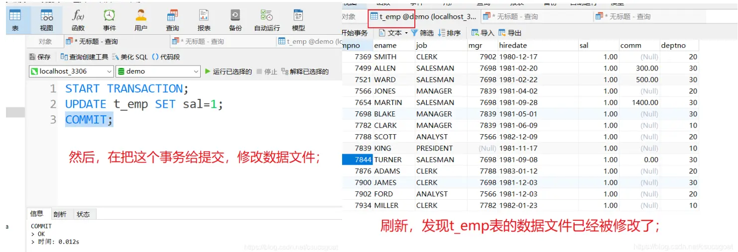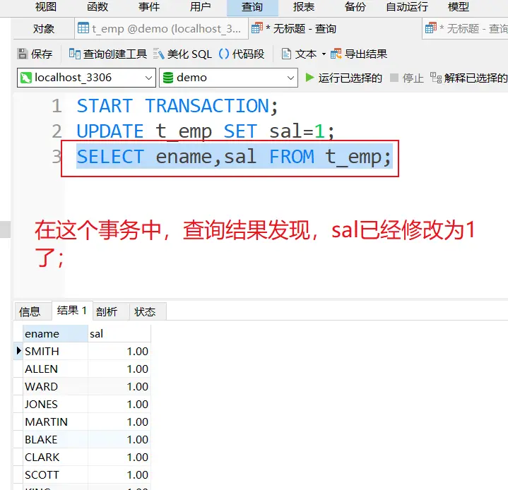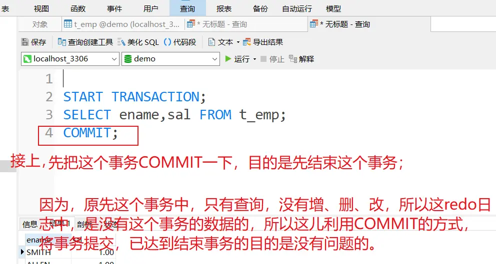 下面需要说明一点:一个事务在执行select操作之后,才能把数据表中的数据copy到undo日志中;;;即下面的事务,如果在【上面的将sal设置为1的事务】提交之前没有select,当【上面的将sal设置为1的事务】提交之后,下面这个事务再第一次执行select的话,其查询的结果就是sal已经被设置为1的t_emp表的数据了 ;( _ _ 好吧,undo日志和redo日志的原理需要了解一下。。。。__ )