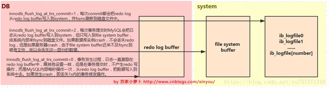 • innodb_flush_log_at_trx_commit=1,每次commit都会把redo log从redo log buffer写入到system,并fsync刷新到磁盘文件中。