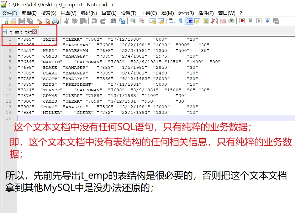 这种方式导出的文档中只有纯粹的数据,而不是SQL语句。 导入文本文档的时候,由于文本文档中没有SQL语句,所以MySQL在导入文本文档的时候是跳过词法分析和语法优化的,直接把文本文档中的数据写入到MySQL的数据文件中;导入文本文档的速度是非常快的;