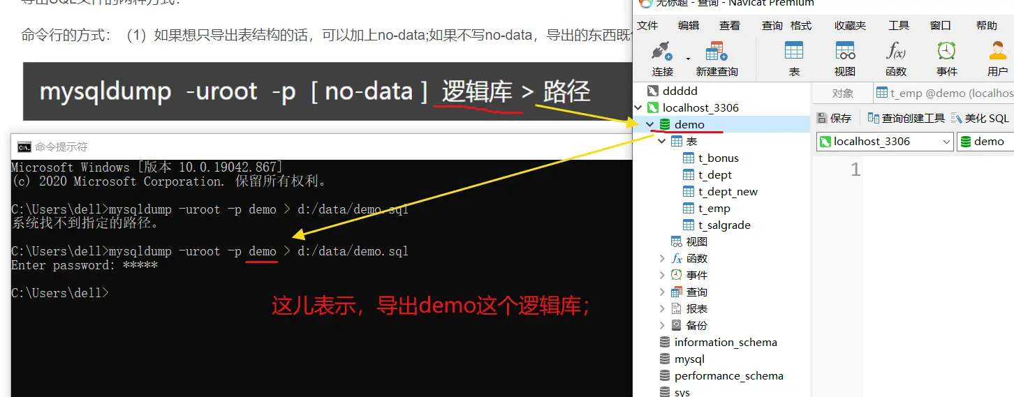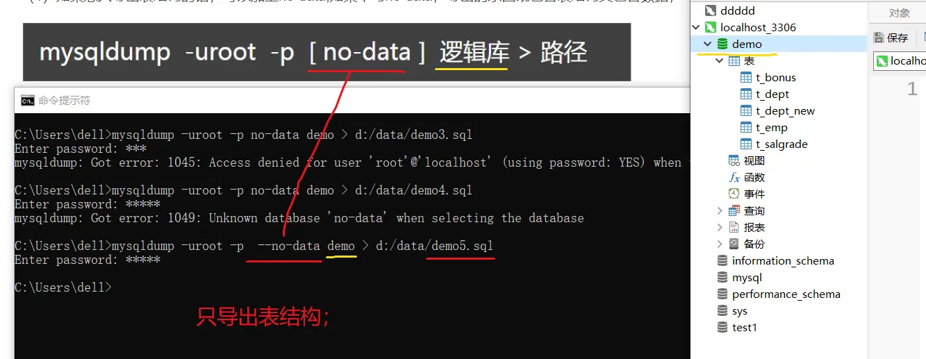 如果想只导出表结构的话,可以加上no-data;如果不写no-data,导出的东西既包含表结构又包含数据;(2)>前后都有一个空格;