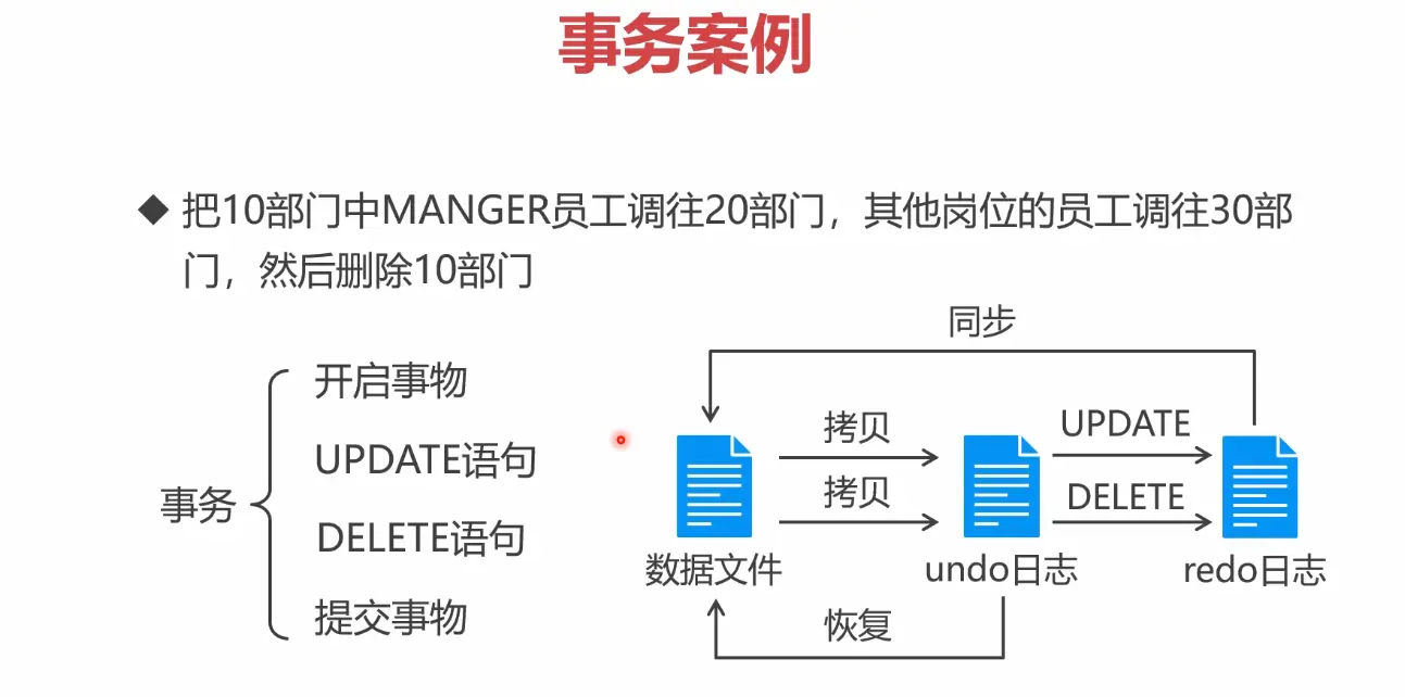 ● 执行过程中,如果发生了意外中断,重启后,如果希望MySQL继续执行事务,就让redo日志继续同步就可以了;;;如果不想MySQL继续同步,就可以把undo日志文件中的数据同步到数据文件中,这样数据文件就恢复到数据提交之前的状态了;