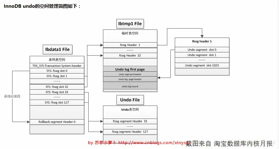 UNDO内部由多个回滚段组成,即 Rollback segment,一共有128个,保存在ibdata系统表空间中,分别从resg slot0 - resg slot127,每一个resg slot,也就是每一个回滚段,内部由1024个undo segment 组成。