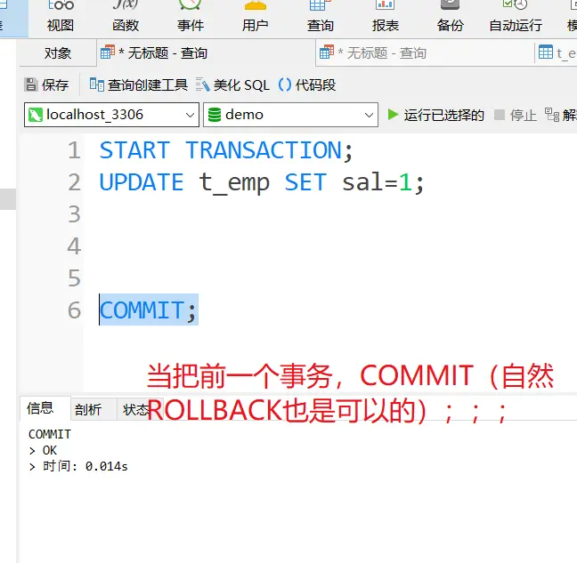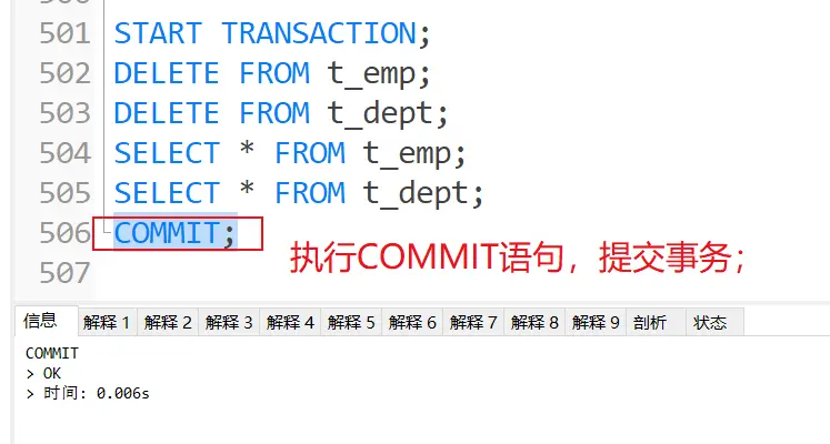 COMMIT:提交的时候,是提交的整个事务的所有内容。一个事务中的所有SQL语句是一个整体,共进退的!!!