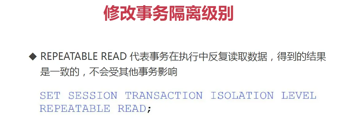 比如“业务案例3”:比如在京东商城中,顾客下单之后在支出订单之前,卖家给商品涨价啦,顾客应该按照涨价之前的价格支付;;;所以,在这个业务场景中,我们希望当前事务的执行不要受到其他事务的影响,甚至其他事务提交以后的结果也不要影响到当前事务。。。这个事务的隔离级别就是【REPEATABLE READ】,这种隔离级别意味着,当前的事务能读到的数据是事务开始之前的数据,事务开启之后,其他事务提交的数据是读不到的;