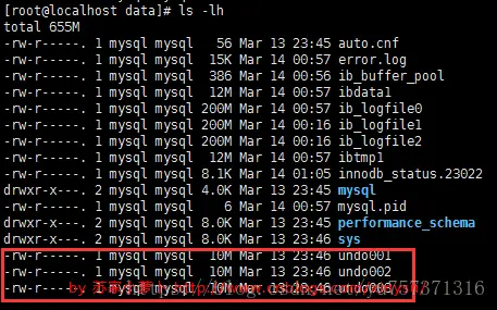 ​ 1 mysql> show global variables like ‘%undo%’; 2 +--------------------------+------------+ 3 | Variable_name | Value | 4 +--------------------------+------------+ 5 | innodb_max_undo_log_size | 1073741824 | 6 | innodb_undo_directory | ./ | 7 | innodb_undo_log_truncate | OFF | 8 | innodb_undo_logs | 128 | 9 | innodb_undo_tablespaces | 3 | 10 +--------------------------+------------+ 11 12 mysql> show global variables like ‘%truncate%’; 13 +--------------------------------------+-------+ 14 | Variable_name | Value | 15 +--------------------------------------+-------+ 16 | innodb_purge_rseg_truncate_frequency | 128 | 17 | innodb_undo_log_truncate | OFF | 18 +--------------------------------------+-------+
