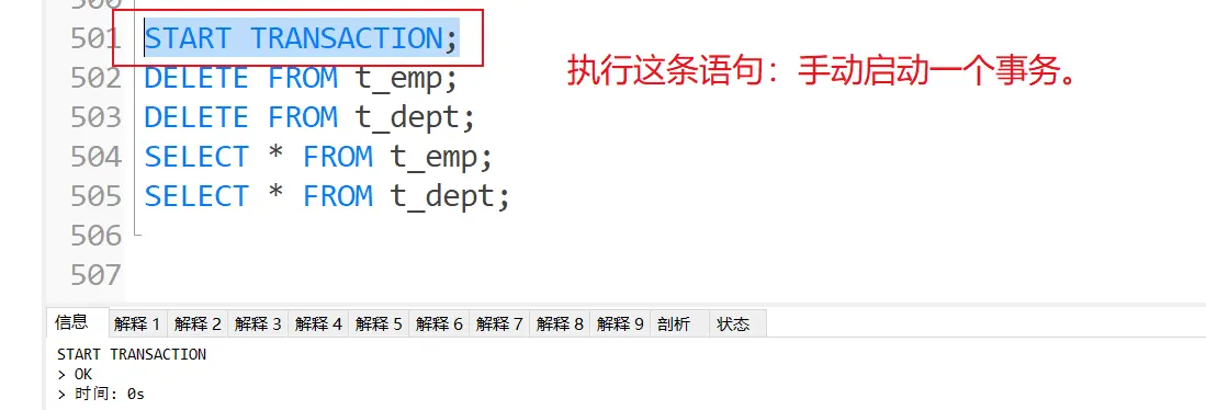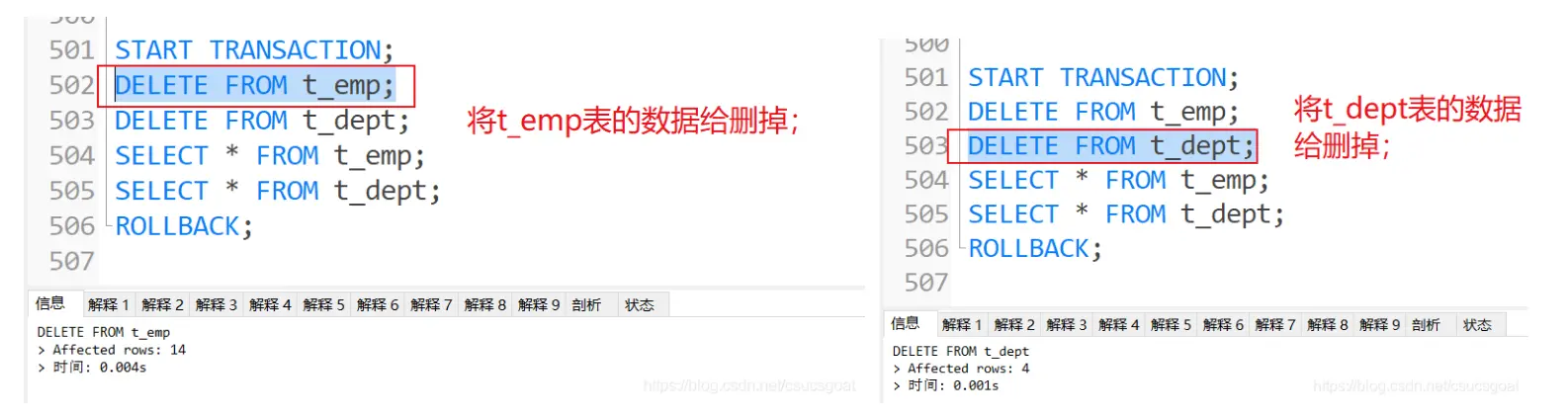 ● 要想实现这个效果,UPDATE语句和DELETE语句必须在同一个事务之下运行才行;;;这就涉及到手动去管理事务了;