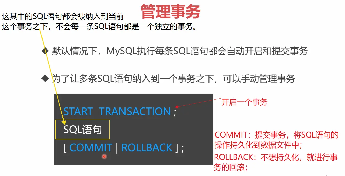 (1)●以前在使用SQL语句的时候,没觉得使用事务啊:这是因为MySQL默认情况下,执行一条SQL语句之前都会为我们开启事务,等这条SQL语句执行完毕之后,MySQL会提交事务(即让redo日志和数据文件作作同步);