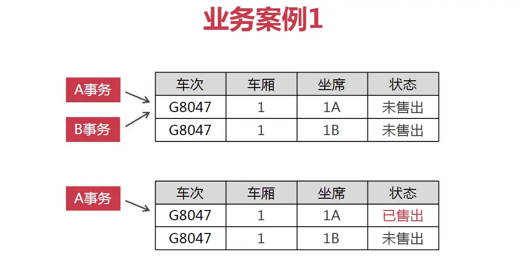 业务案例1:A事务看到G8047 1车厢1A坐席是未售出状态,于是A事务就使用UPDATE语句修改了这条记录的状态为已售出,因为A事务还没有提交,所以修改操作只是记录在了redo日志中,真实的数据并没有发生改变。。。。如果,此时B事务启动了,B事务也会看到G8047 1车厢1A坐席是未售出的,于是B事务使用UPDATE修改了这条记录的状态为已售出,然后B事务很快就提交了,于是真实的数据文件就发生了改变。。。。此时,A事务再去提交事务,就发现这个坐席已经是已售出了,于是A事务就引发了回滚操作。