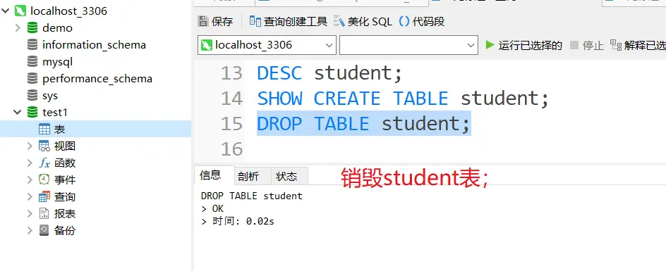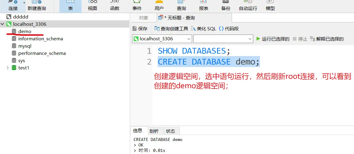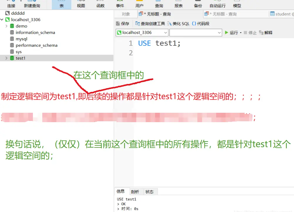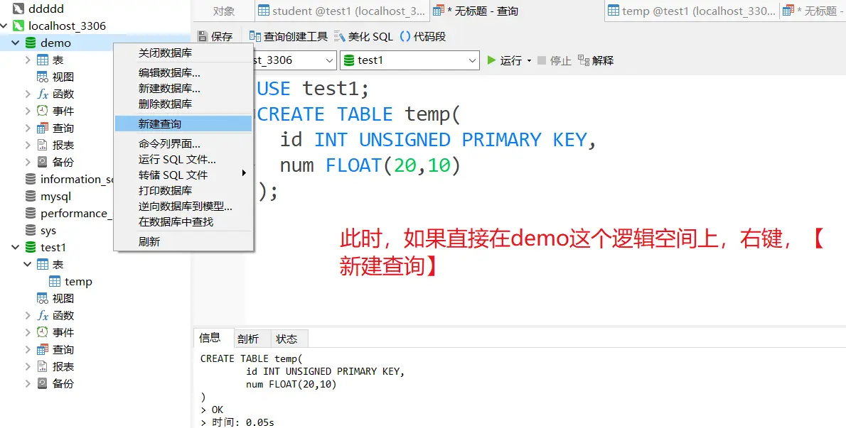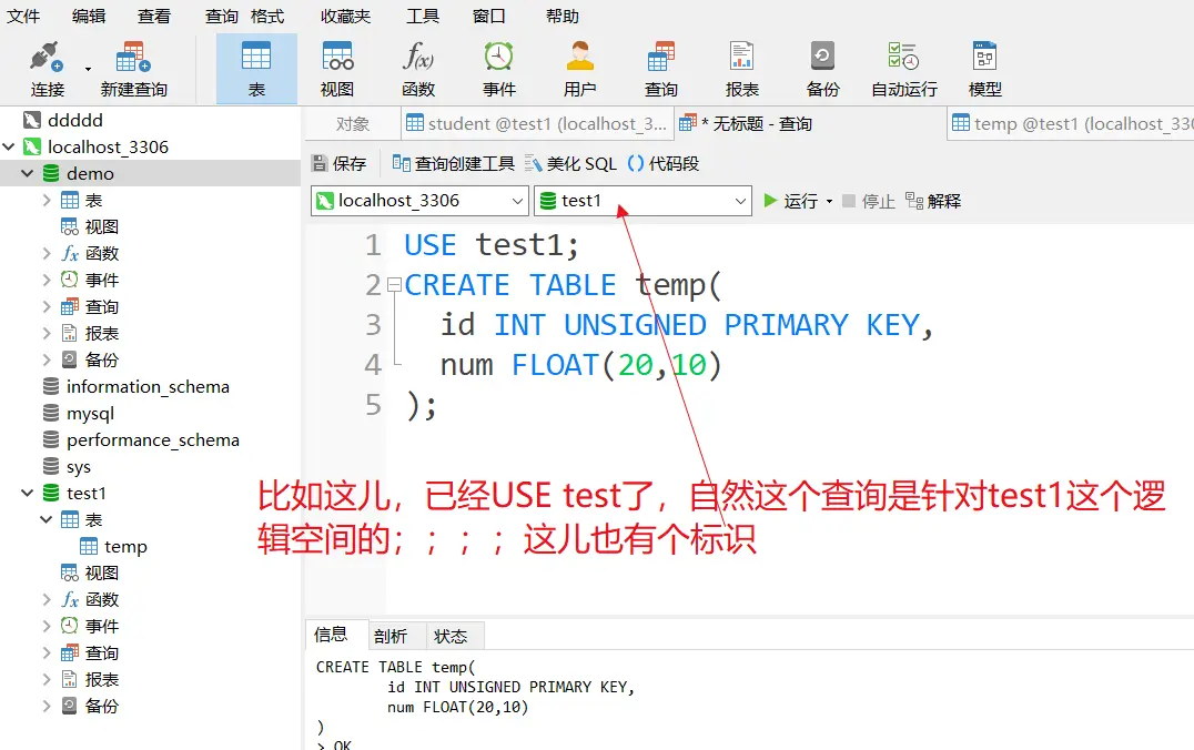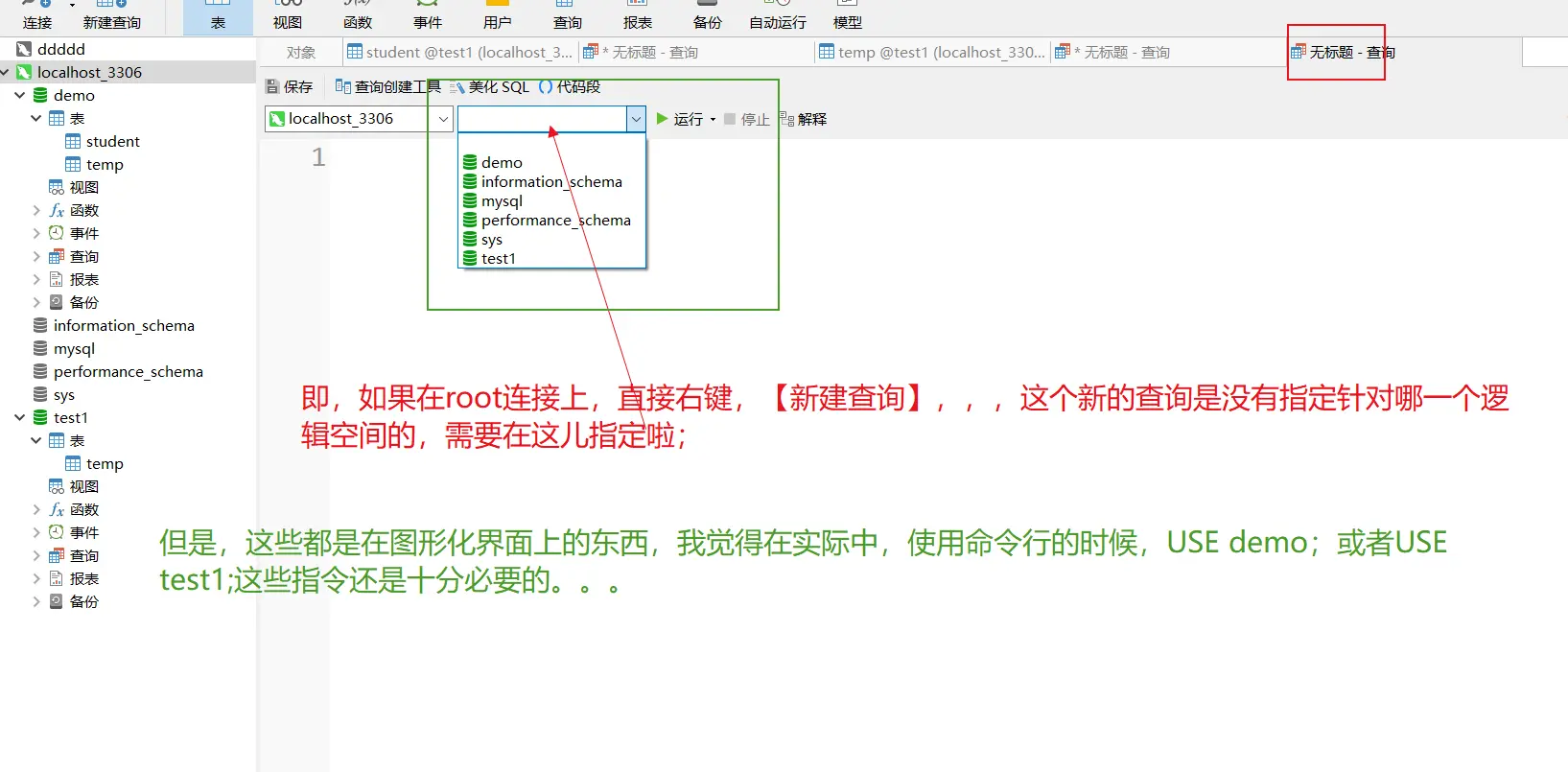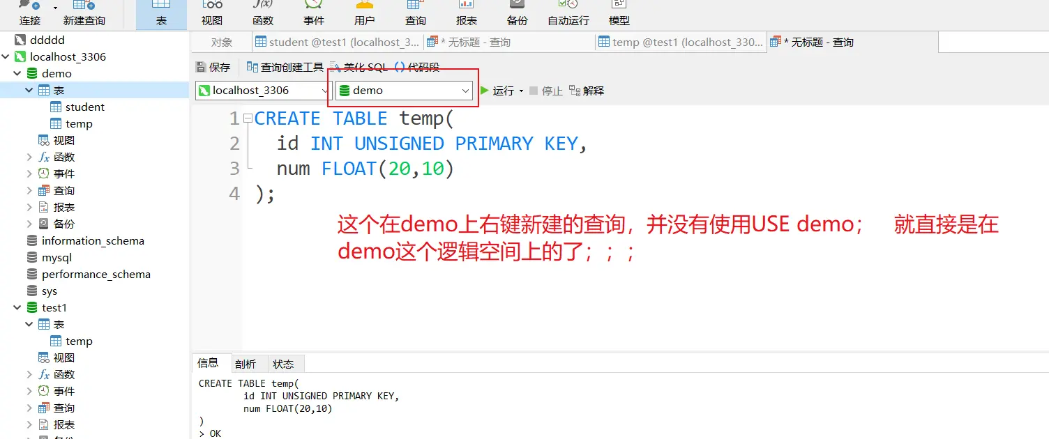 经过实测,如果当前不想操作test1这个逻辑库了,而是想去操作demo这个空间,只需要【USE demo;】就可以了,或者新建一个查询框,然后指定这个新建的查询框是针对demo的就好了。