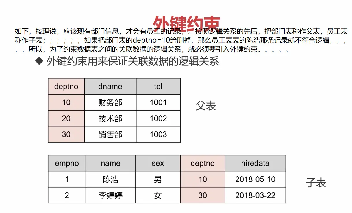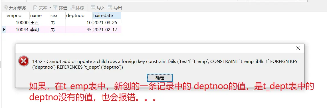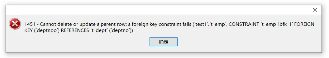 正确的做法是,先把t_emp表中,所有deptno=10的记录,然后再删除t_dept表中deptno=10的那条记录。