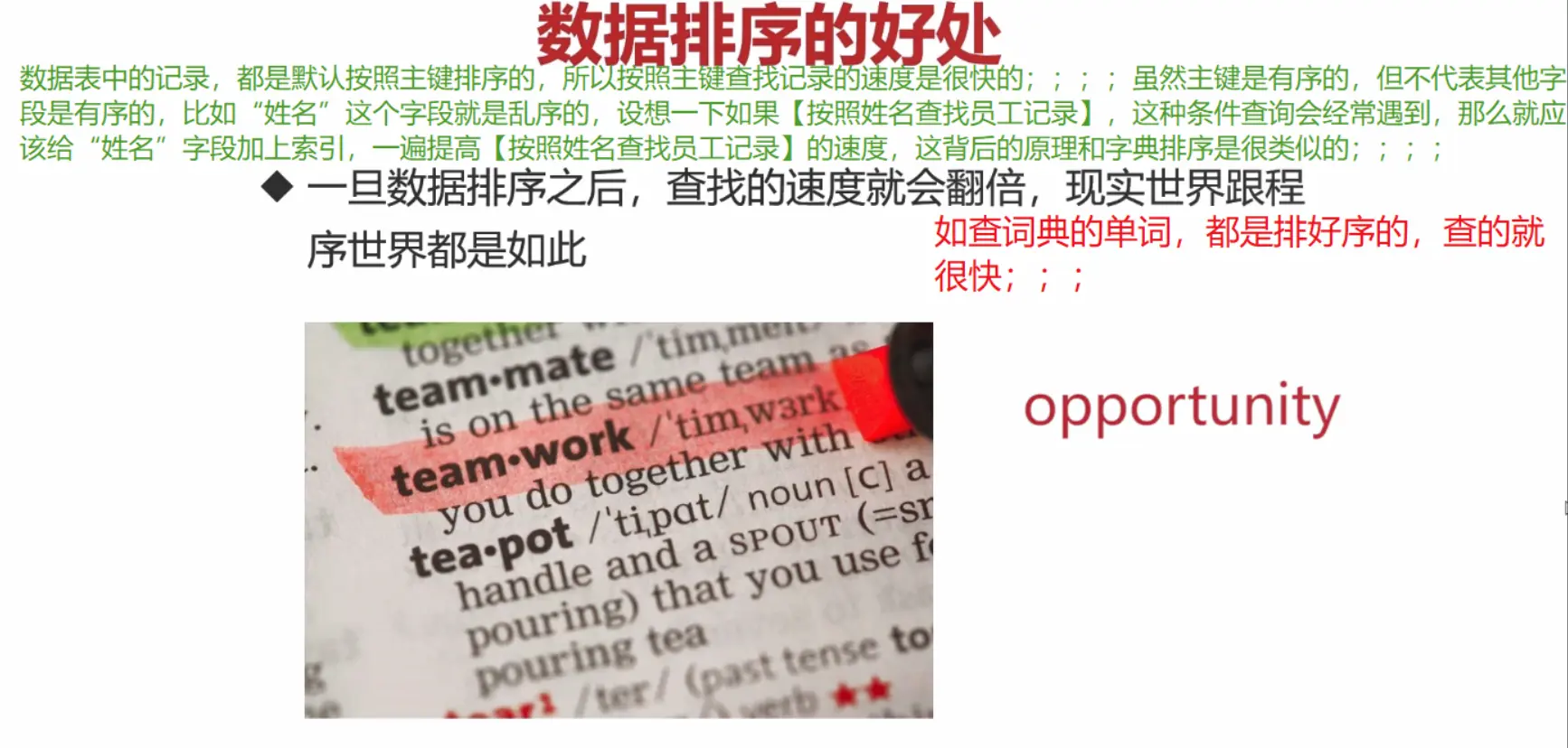 ● 索引:数据库中提高数据检索速度的重要技术!!!类似于常用的字典,索引技术就是对数据排序,来加速查找的;
