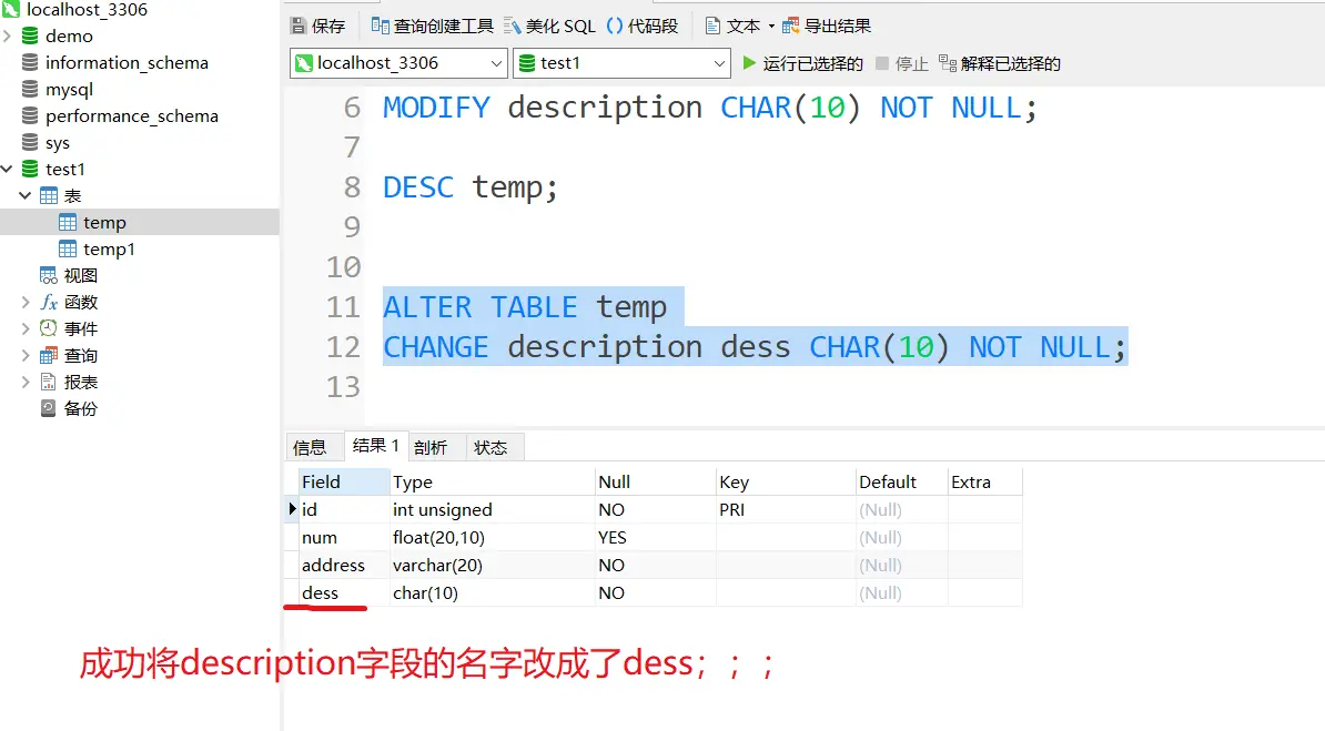 ALTER TABLE temp CHANGE description dess CHAR(10) NOT NULL;