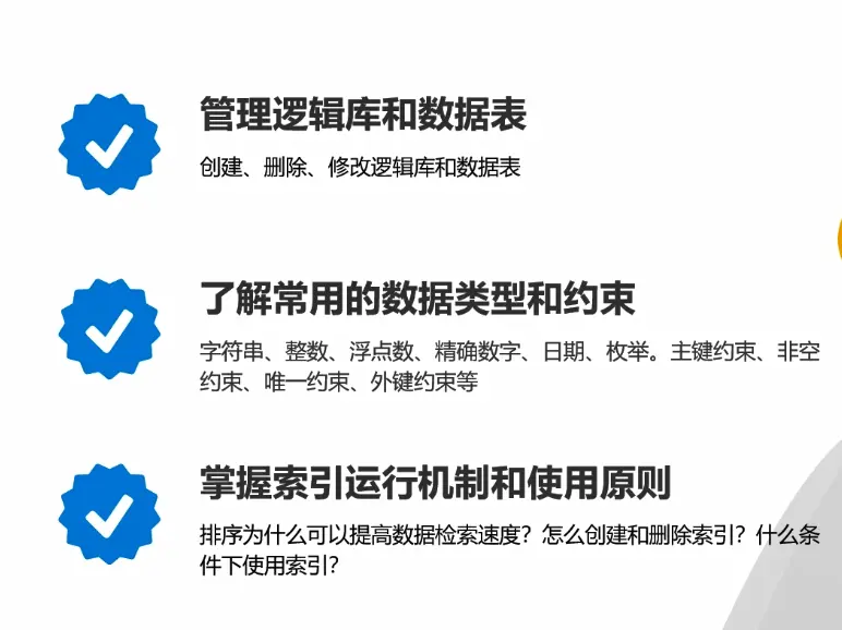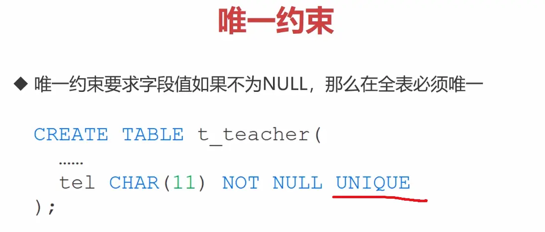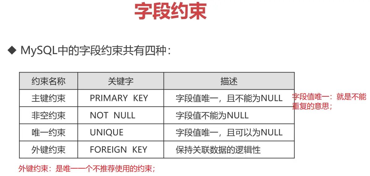 除了可以用数据类型来限定字段的内容,还可以用约束更进一步限定字段的内容;如:(1)定义年龄字段是整数类型,但是没有规定这个字段的值不能为空,为此可以给年龄字段添加非空约束;(2)为了让某个字段不能重复,可以给这个字段添加唯一性约束;