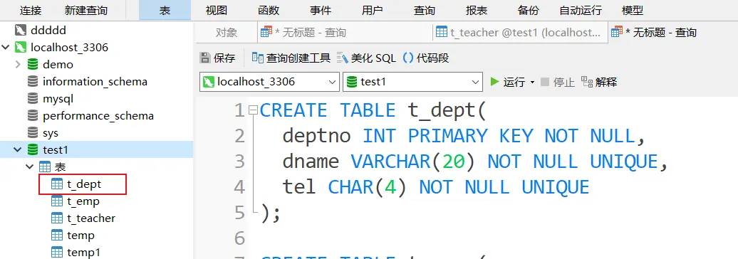CREATE TABLE t_dept( deptno INT PRIMARY KEY NOT NULL, dname VARCHAR(20) NOT NULL UNIQUE, tel CHAR(4) NOT NULL UNIQUE );