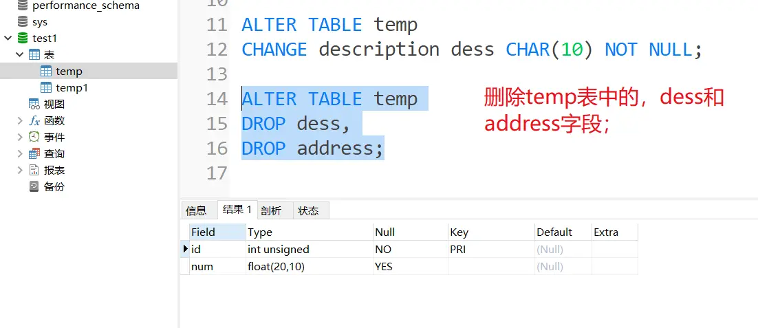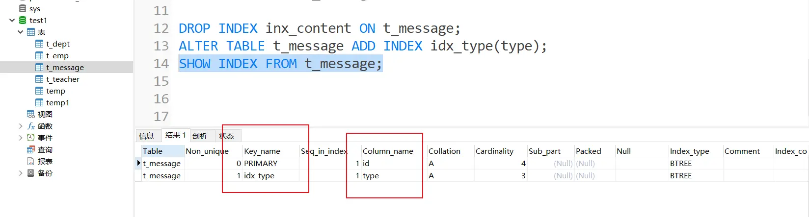 示例2:删除在content字段上的“idx_content”索引,在type字段上创建“idx_type”索引,并查看t_message表的索引::: 这些语句好像不能一起执行,只能执行完一条,再去执行下一条。