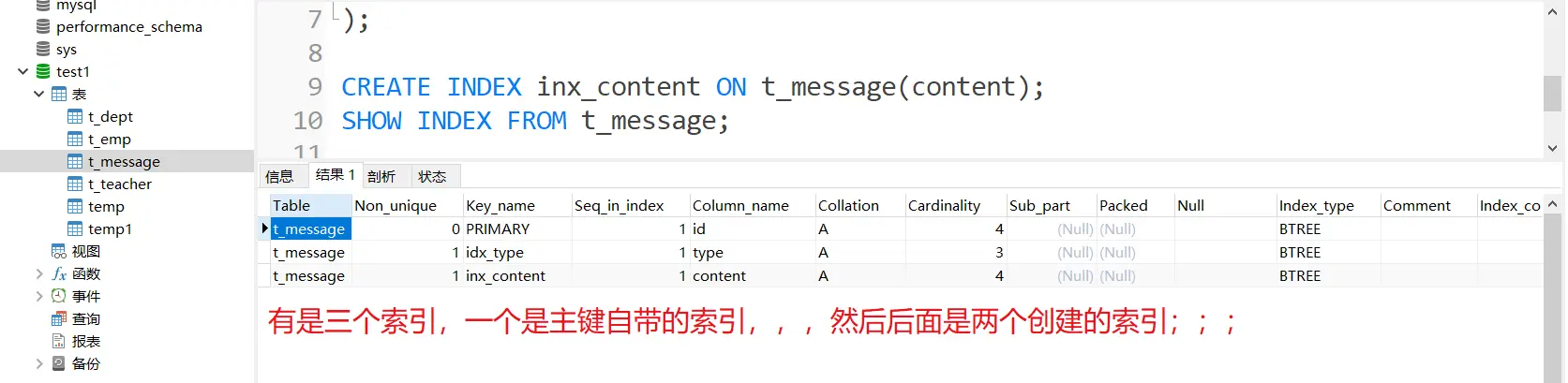 示例1:给t_meaaget的content字段添加索引,并查看t_message表的索引:::: 这些语句好像不能一起执行,只能执行完一条,再去执行下一条。