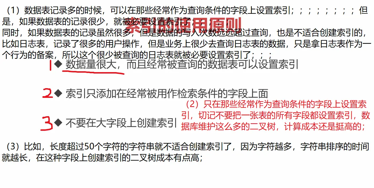 只有引入索引机制,才能在数据表有超大量数据的情况下,还能保持查找的高速;主键字段自带索引,所以,利用主键作为查询条件也可以保持高速;但是那些非主键字段如果不设置索引,当表中数据非常多,并以这些非索引字段为查询条件的时候,查询的会非常慢,所以,我们应该给那些经常作为检索条件的字段,设置上索引。