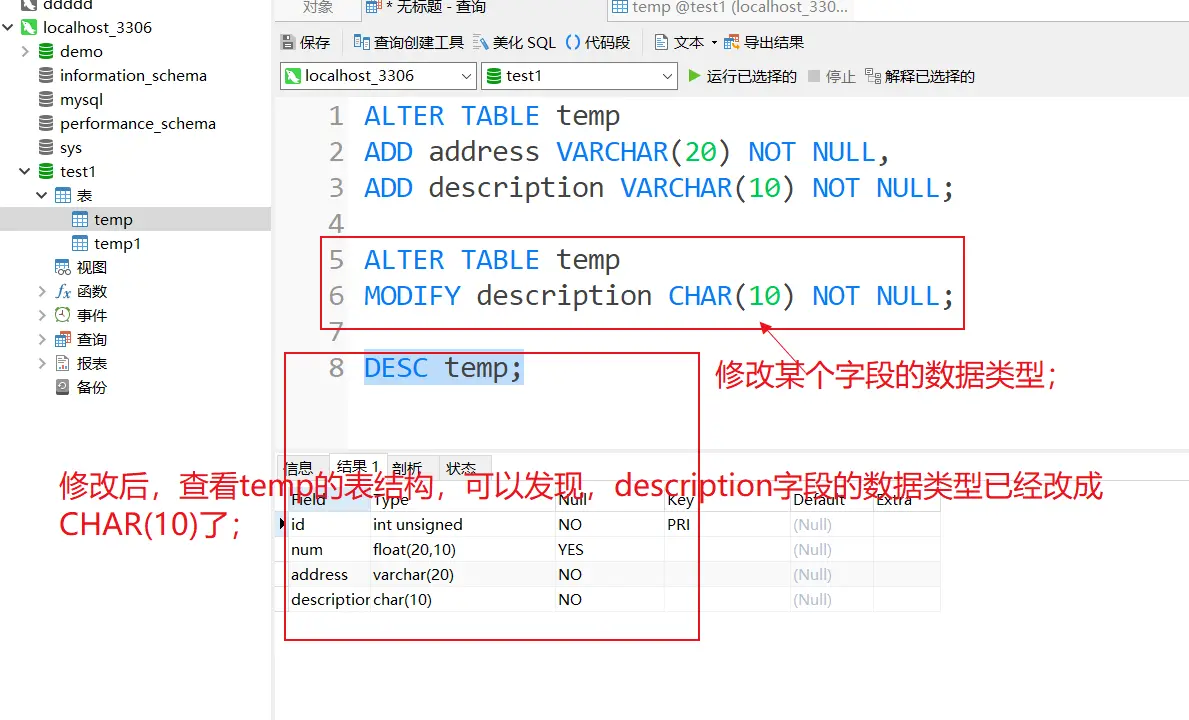 ALTER TABLE temp MODIFY description CHAR(10) NOT NULL;
