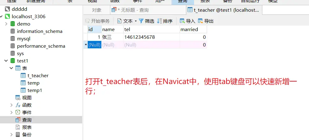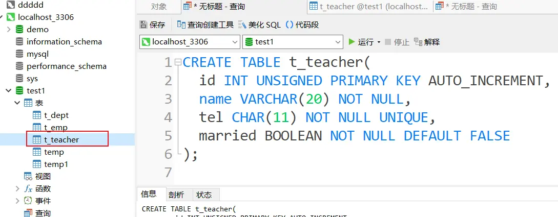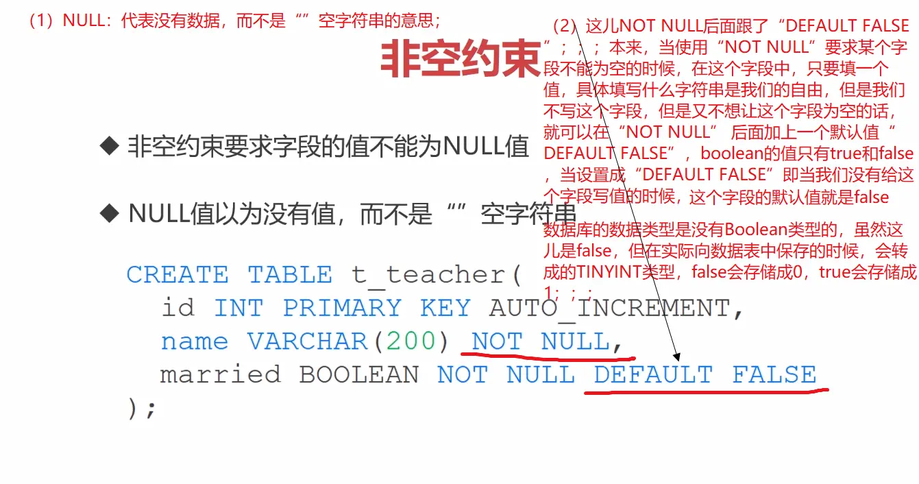 CREATE TABLE t_teacher( id INT UNSIGNED PRIMARY KEY AUTO_INCREMENT, name VARCHAR(20) NOT NULL, tel CHAR(11) NOT NULL UNIQUE, married BOOLEAN NOT NULL DEFAULT FALSE );