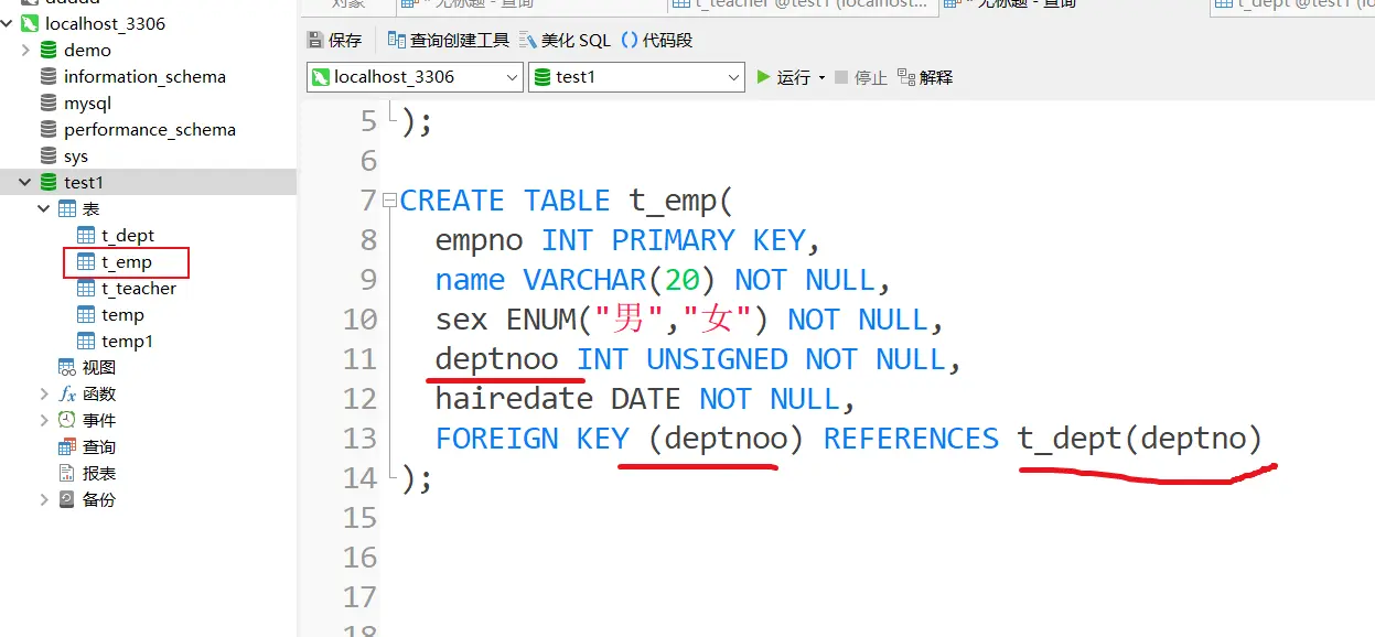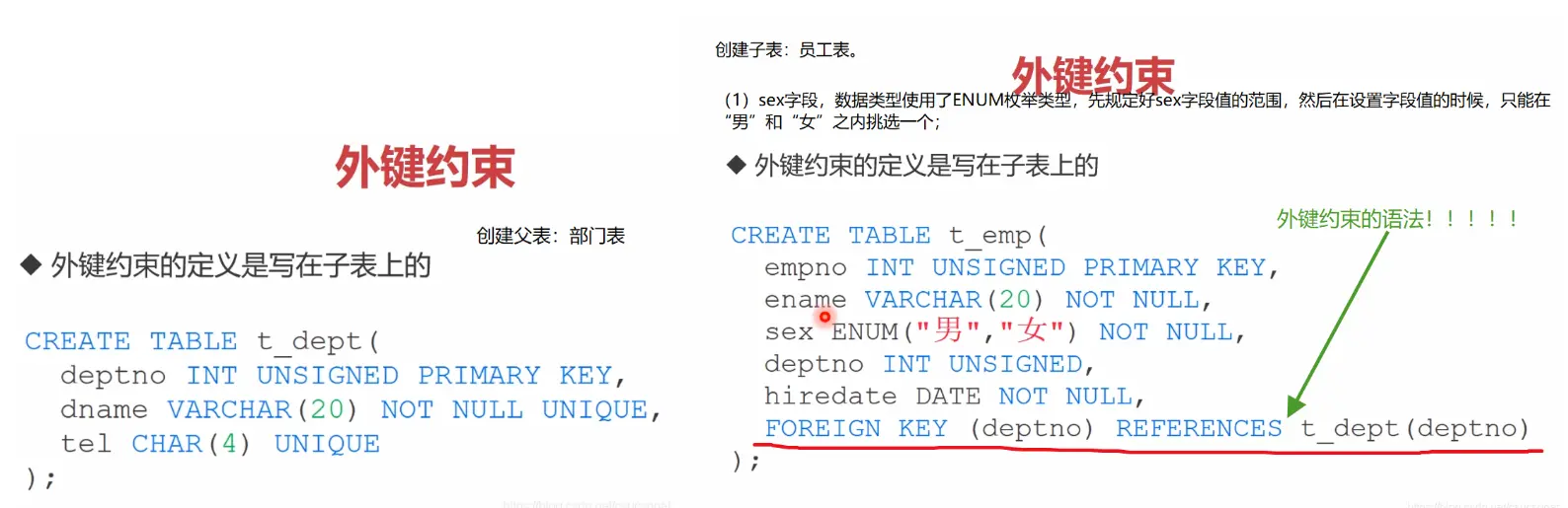CREATE TABLE t_emp( empno INT PRIMARY KEY, name VARCHAR(20) NOT NULL, sex ENUM(“男”,“女”) NOT NULL, deptnoo INT NOT NULL, hairedate DATE NOT NULL, FOREIGN KEY (deptnoo) REFERENCES t_dept(deptno) );