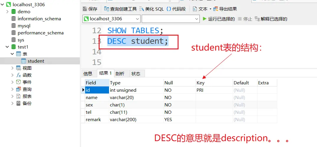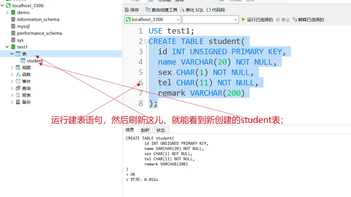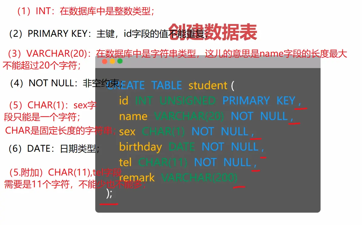 CREATE TABLE student( id INT UNSIGNED PRIMARY KEY, name VARCHAR(20) NOT NULL, sex CHAR(1) NOT NULL, tel CHAR(11) NOT NULL, remark VARCHAR(200) );