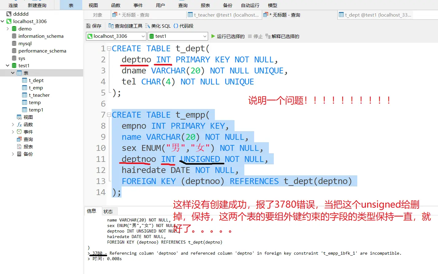 注解:说明的第二个问题 ;这个问题,那个太关心啦,因为实际中基本不会使用外键约束的。。。