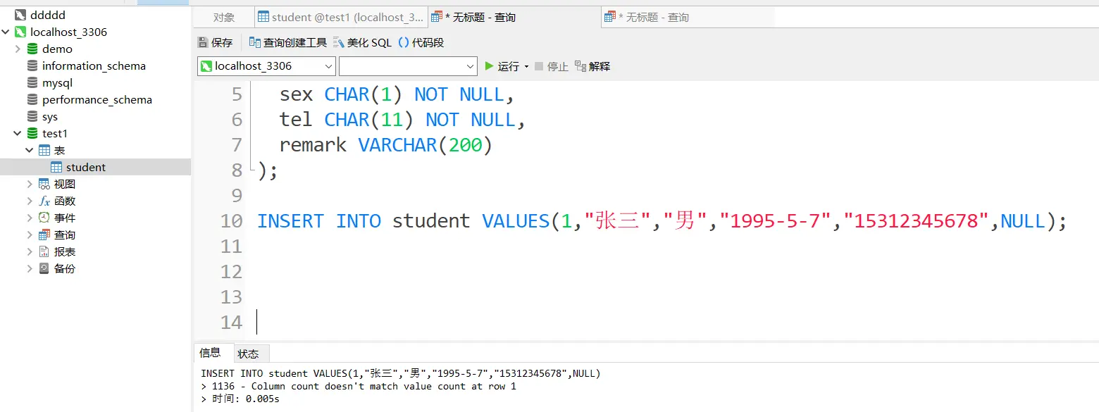 INSERT INTO student VALUES(1,“张三”,“男”,“1995-5-7”,“15312345678”,NULL);