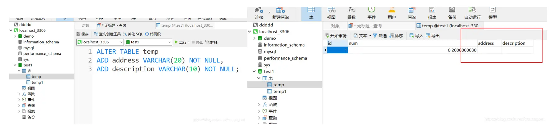 ALTER TABLE temp ADD address VARCHAR(20) NOT NULL, ADD description VARCHAR(10) NOT NULL;