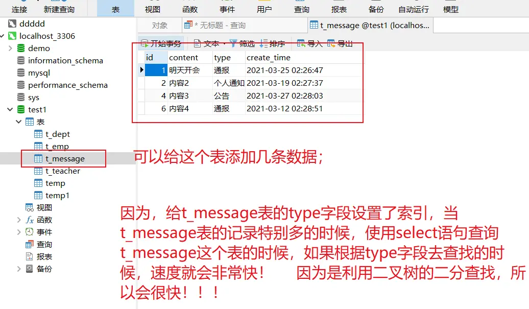 示例:创建t_message表,并给其type字段设置索引,索引名字叫”idx_type”;
